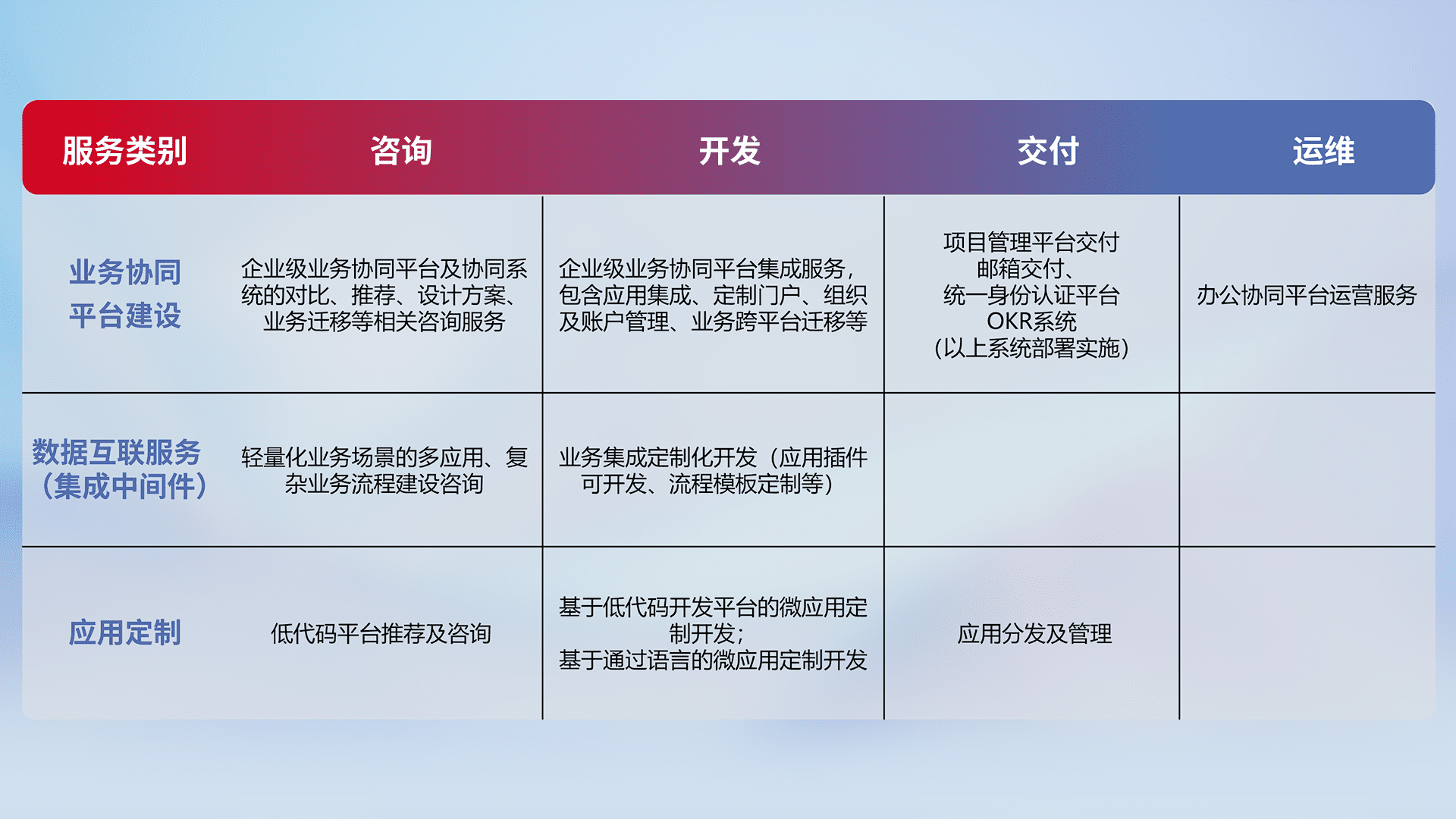 针对钉钉、、企微、、、、IDaas等平台级产品提供产品的规划、、、、方案、、、交付、、、定制化开发等服务,,,,实现如统一协同办公、、、、智能客户服务、、混合会议管理、、、、智能数据查询、、、、等业务场景,,实现数字化转型。。
